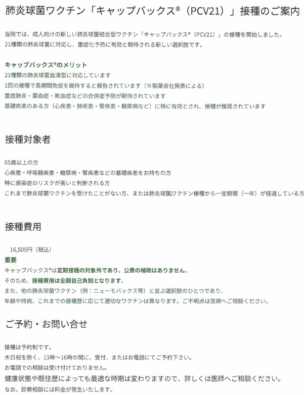 肺炎球菌ワクチン「キャップバックス®」接種のご案内